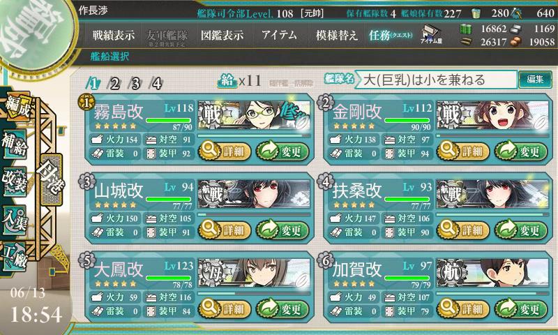 うちには大和も武蔵もいないので、金剛型4人+空母で行きます。大鳳をチョイスしているのは中破でも攻撃できるからです。