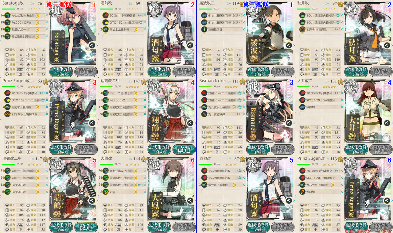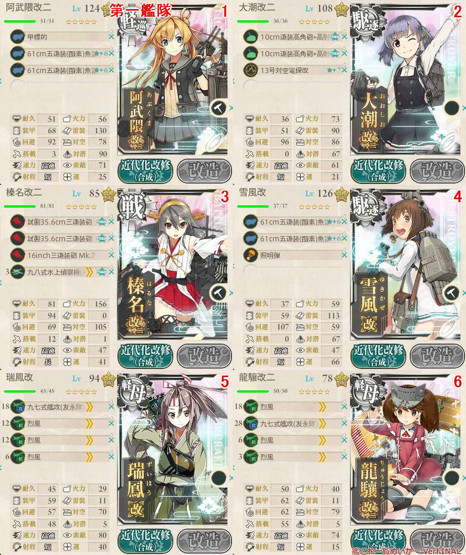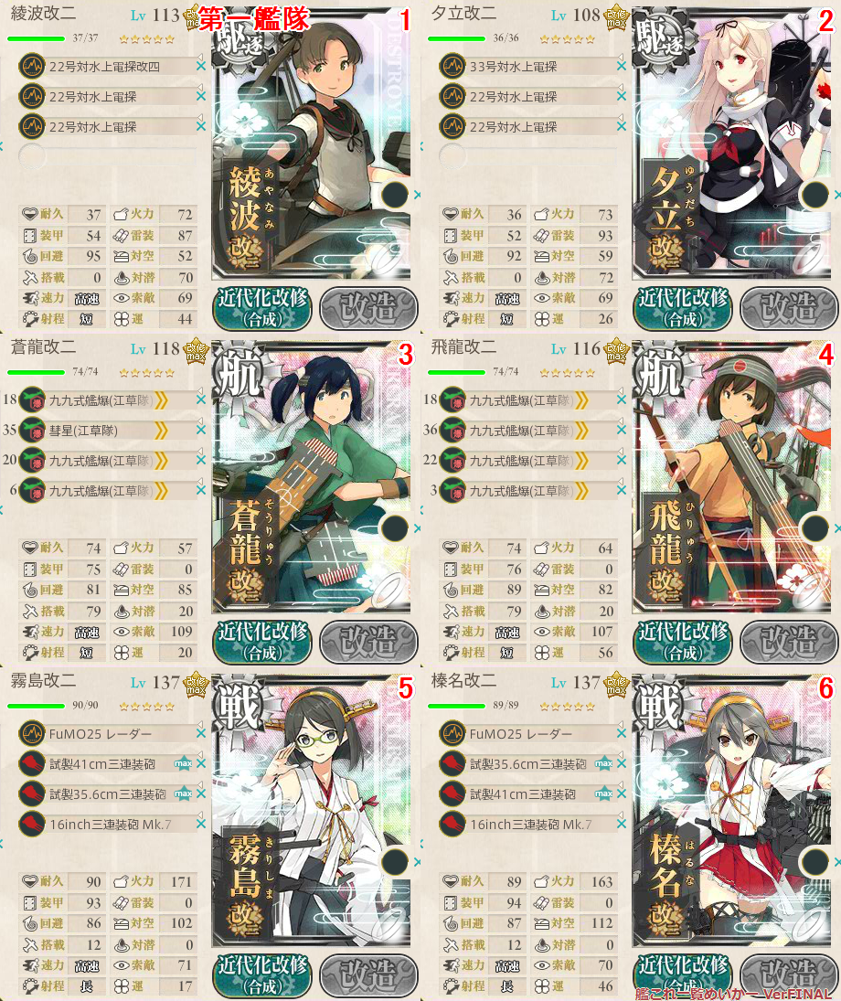 とにかくボスでは第二艦隊を削らないとSが取れないので昼間の火力を優先して戦艦を3隻配置。