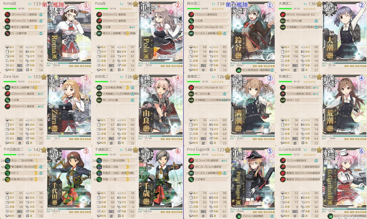 一見するとそうなのです、事実道中はガリバルディを阿武隈に、Prinzを雷巡にした方が安定します。ただボスの第二艦隊に対して全然ダメージ出なくて、第一が相手の第二に吸われて結局ボスがHPたくさん残るという結果になってA敗北になってしまいます。