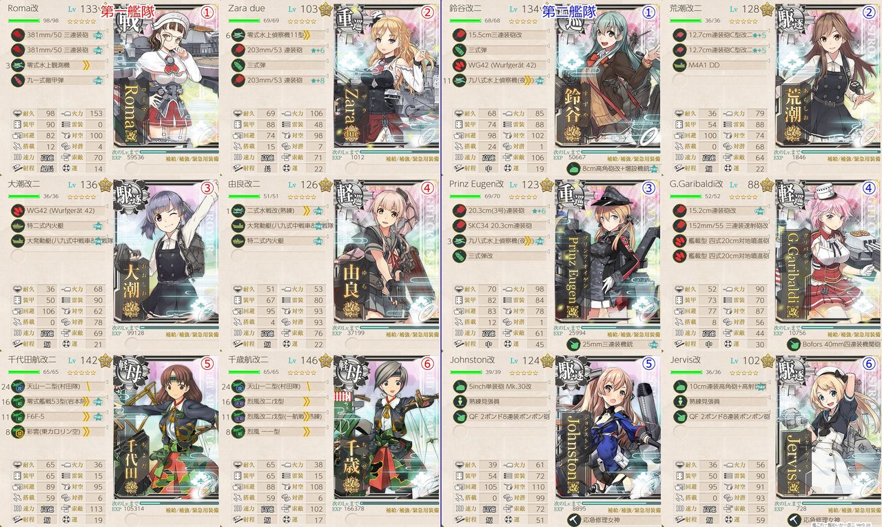 道中はなくてもいけるかなと思いつつフラツの事故対策で出しています。また道中は同航戦キャップ、ボスは反航戦キャップを意識して装備を積んでいます。道中支援