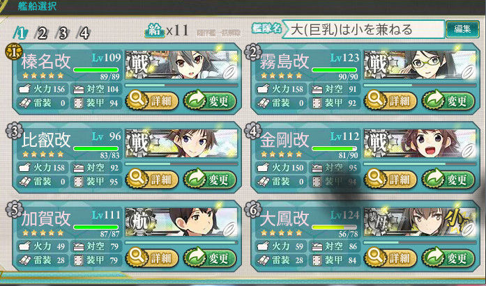 うちには大和も武蔵もいないので、金剛型4人+空母で行きます。大鳳をチョイスしているのは中破でも攻撃できるからです。