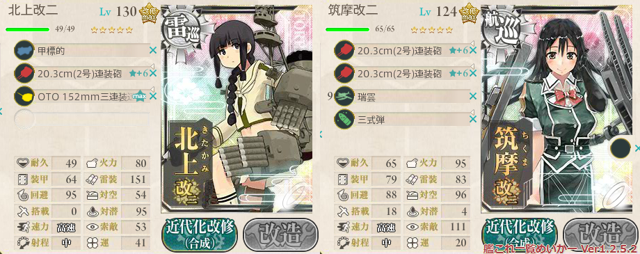 北上は潜水艦対策もかねて入れる。ボス戦の夜戦だと3式がないのであまり役に立たないのが残念。