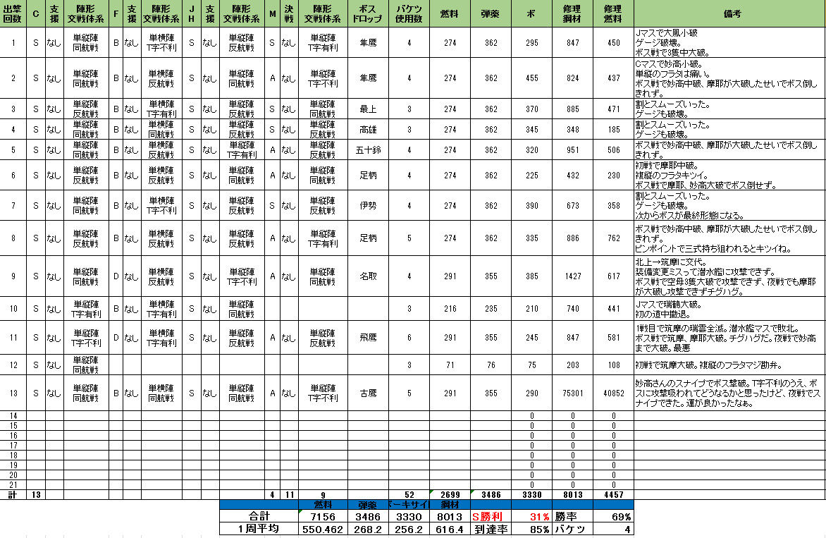 ボスへの到着率はいいんだけど、A敗北が多かった感じかな。北上はさいしょから筑摩でも良かったかも。