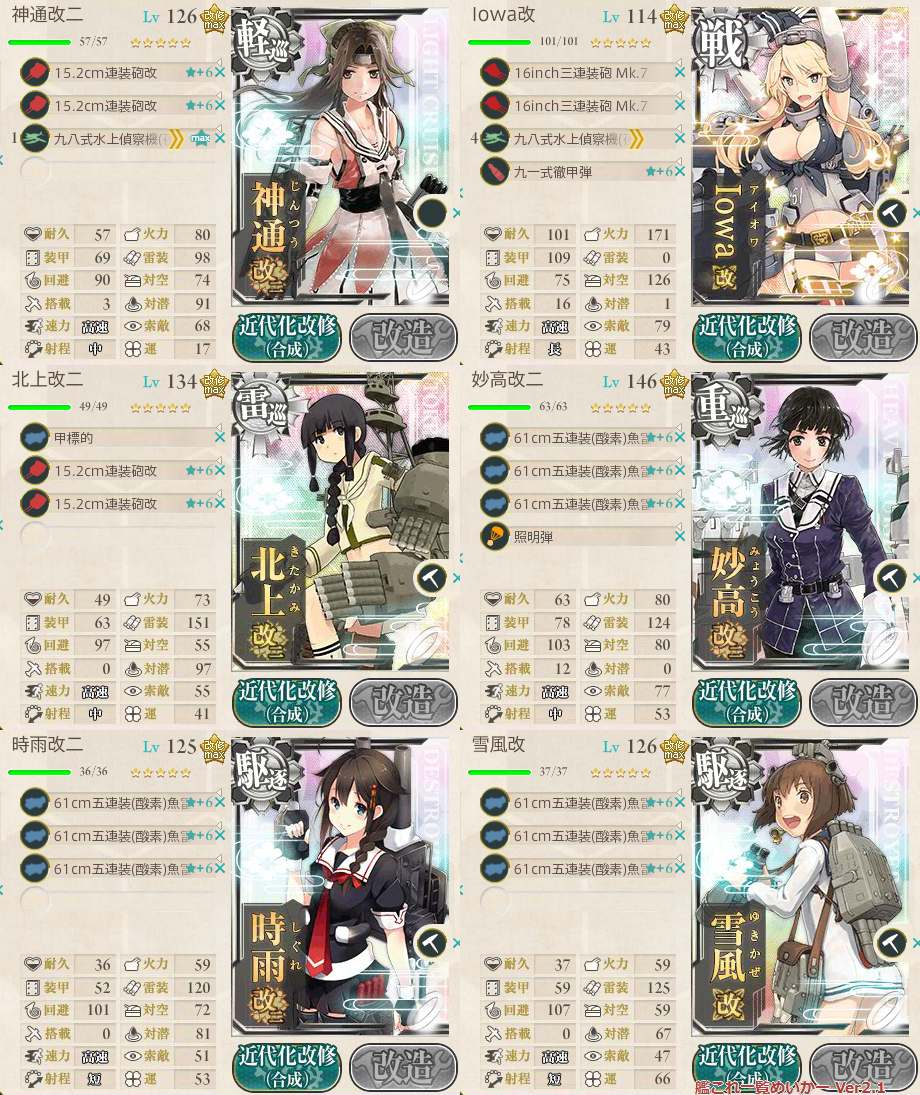 最初はもっとカットインマシマシにしてたんだけど、昼間の敵が残って危険なのでアイオワをいれて北上さんを連撃にしまた。