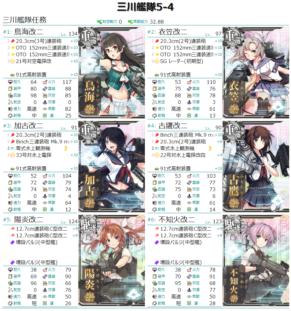 「鳥海」「青葉」「衣笠」「加古」「古鷹」「天龍」「夕張」から4隻、自由枠2隻の編成を用い5-1,5-3,5-4それぞれでS勝利