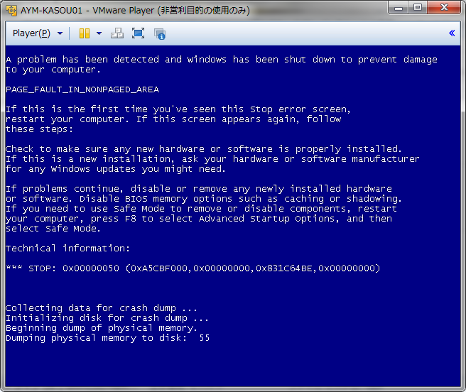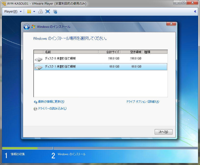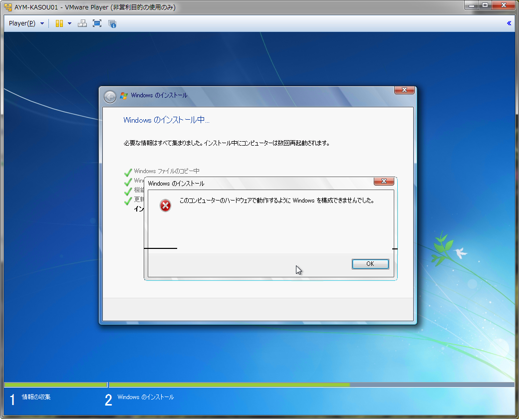 Windows 7でユーザプロファイルフォルダ(C:\Users)を別ドライブに移してみるを仮想サーバで実験してみる②OSインスコ編 2014年01月22日 カテゴリ:日常エンジニアリングwindows7 mixiチェック バーチャルクローンドライブにISOファイルマウントして準備完了。仮想マシンパワーオン。 パワーオン次へをおしていますぐインストールにする。 同意します。次へ。カスタムインストールを選択。60GBの方を選択する。でOKおすとインスコはじまる。やっぱインストールの最終構成の確認中にエラーになる。 再起動がかかりブルースクリーン。何だろう。メモリの設定がいかんかな。とりあえず最小構成でやってみよう。 というわけで起動ディスクだけ消してチャレンジしてみる。→失敗。同様の操作をISOイメージからではなくてDVDメディアからにして、CPU1つにして、メモリも2048に減らして、ネットワークはブリッジにしてパワーオフこれでなんとかできた。やっぱメモリだったのかな。あとでいじってみよう。やっと本題にはいれるぜ。