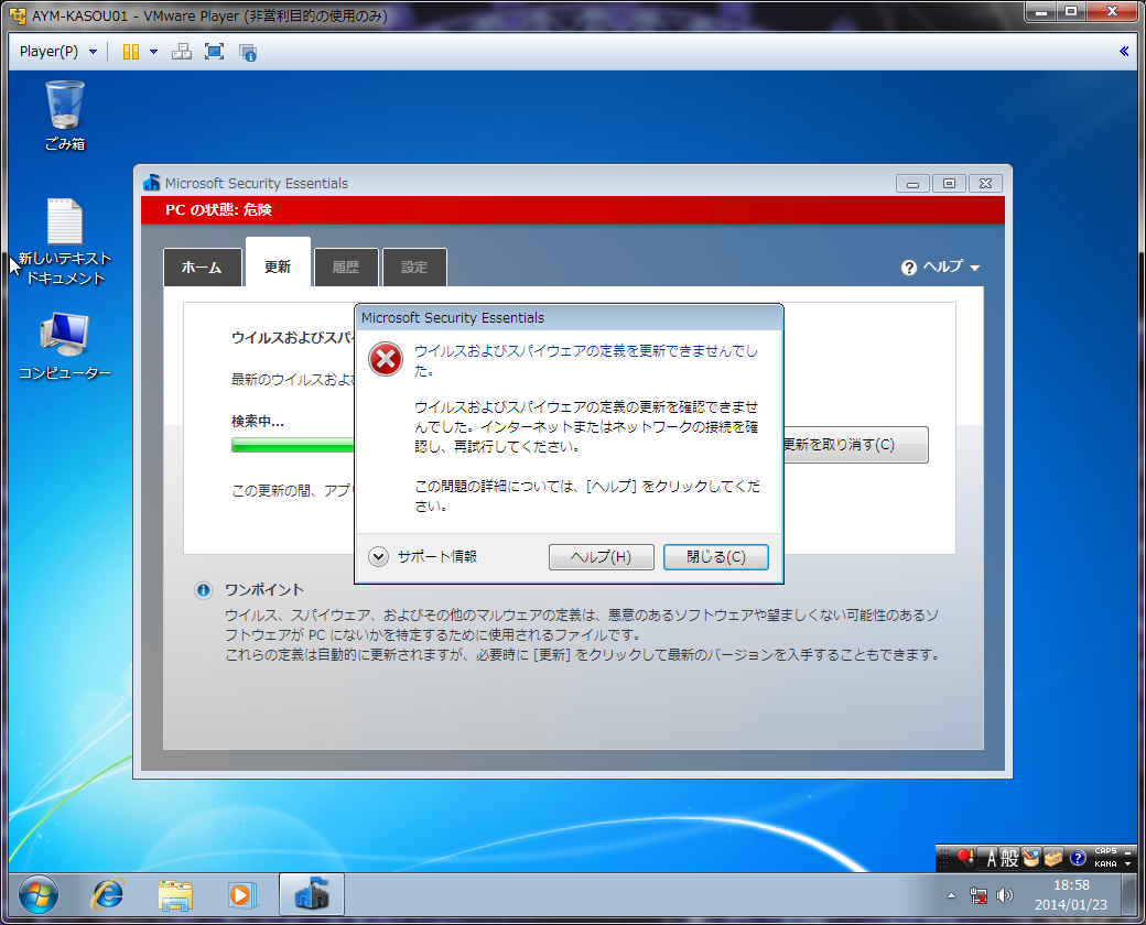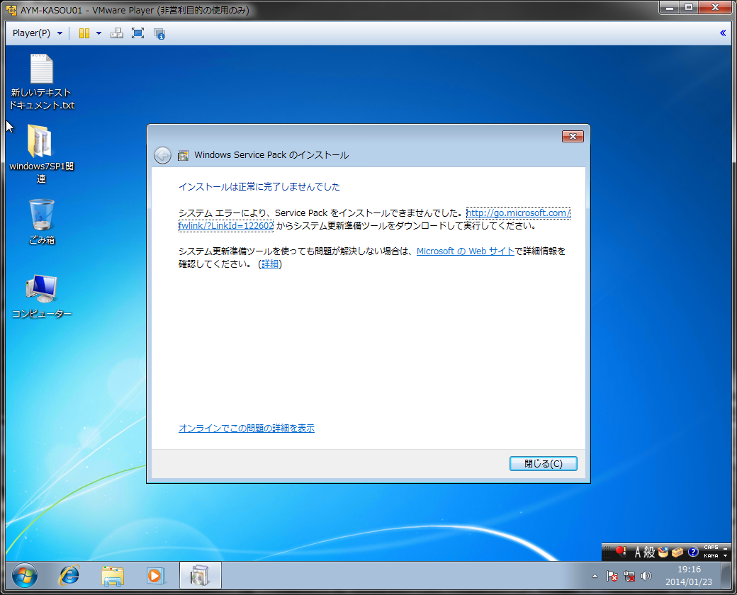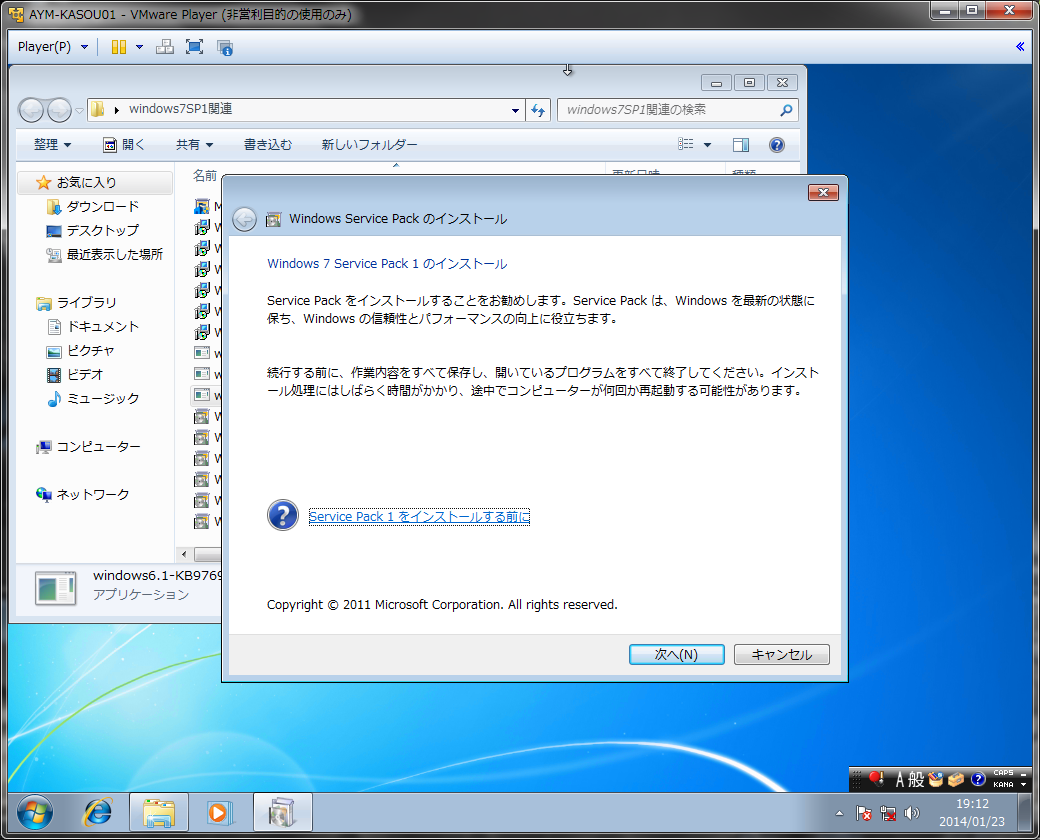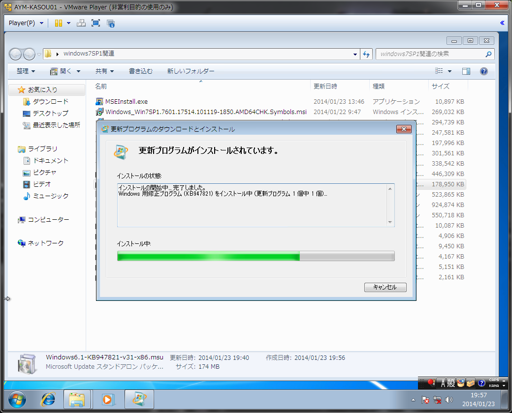 Windows7をNW接続のない状態でSP1にする。 2014年01月23日 カテゴリ:日常エンジニアリングwindows7 mixiチェック アップデートに時間がかかるのでSP1へNWに接続されていない状態でアップデートできないか挑戦してみる。http://windows.microsoft.com/ja-jp/windows7/learn-how-to-install-windows-7-service-pack-1-sp1 ここの記事を参照にしながらやります。 ここからISOをダウンロードしてやればよいようだが、ほかにもいろいろあるので全部ダウンロードしておく。Microsoft Security Essentialsもダウンロードしておく。ばしょはココ。手順はここを参照。手順 1: 重要なファイルをバックアップする仮想OSなのでどうしよう。とりあえずシャットダウンしてコピーしておくか。 手順 2: デバイス ドライバーを更新する仮想OSだし、実機でやるときは問題になるかも。メモメモ。重要: Intel 統合グラフィックス デバイスを使用している場合、特定バージョンの Intel 統合グラフィックス デバイス ドライバーや、特定バージョンの Windows Mail のような D2D 対応アプリケーションに既知の問題があります。手順 3: Windows Update にアクセスし、Windows 更新プログラム KB2454826、KB2534366、または KB2533552 をインストールする (提供されている場合)先ほどダウンロードしたので入れておこう。めんどくさいからDVDにまとめてSP1とは別に焼いておく。とりあえずデスクトップにコピー。コピー終わったらダブルクリックしてインストール。ひとつずつ再起動聞かれるけどめんどくさいから3ついく。3ついれたので再起動。手順 4: ウイルスおよびマルウェアをチェックするMicrosoft Security Essentialsつかってマルウェアがないかチェックする。とりあえずインストールしちゃいます。インストール後検索しますが、NWつながってないのでエラーでますが無視します。結局NWにつながってないと動かないのであんましこの手順は意味ないかも。まぁクリーンインストールでNW接続なしからだから、マルウェアがはいりようないしね。手順 5: Windows 7 SP1 または Windows Server 2008 R2 SP1 をインストールする setup.exe実行しちゃいます。反応しない・・・・。なんだこれ・・・。再起動してもだめぽ・・・・。????ダウンロードしていたexe版をクリックしてみる。うごいた。とりあえず次へいってみるか。 しっぱいしたぽ・・・。 むむむ・・・。どうやらWindows 7 用のシステム更新準備ツール (KB947821) とやらがたりなかったらしい。もっかい焼くか。とりあえず32ビット版と64ビット版ダウンロードしておこう。でもってインストール。再起動してチャンレンジ。やっぱりエラーでとまる。うーむ・・・。あきらめてネットでやるか。 135個でてきた。最初に悪意のソフトが出てきたのでそれを入れておけばよかったのかな。 SP1もあたったし、あんまり深く考える必要ないかw