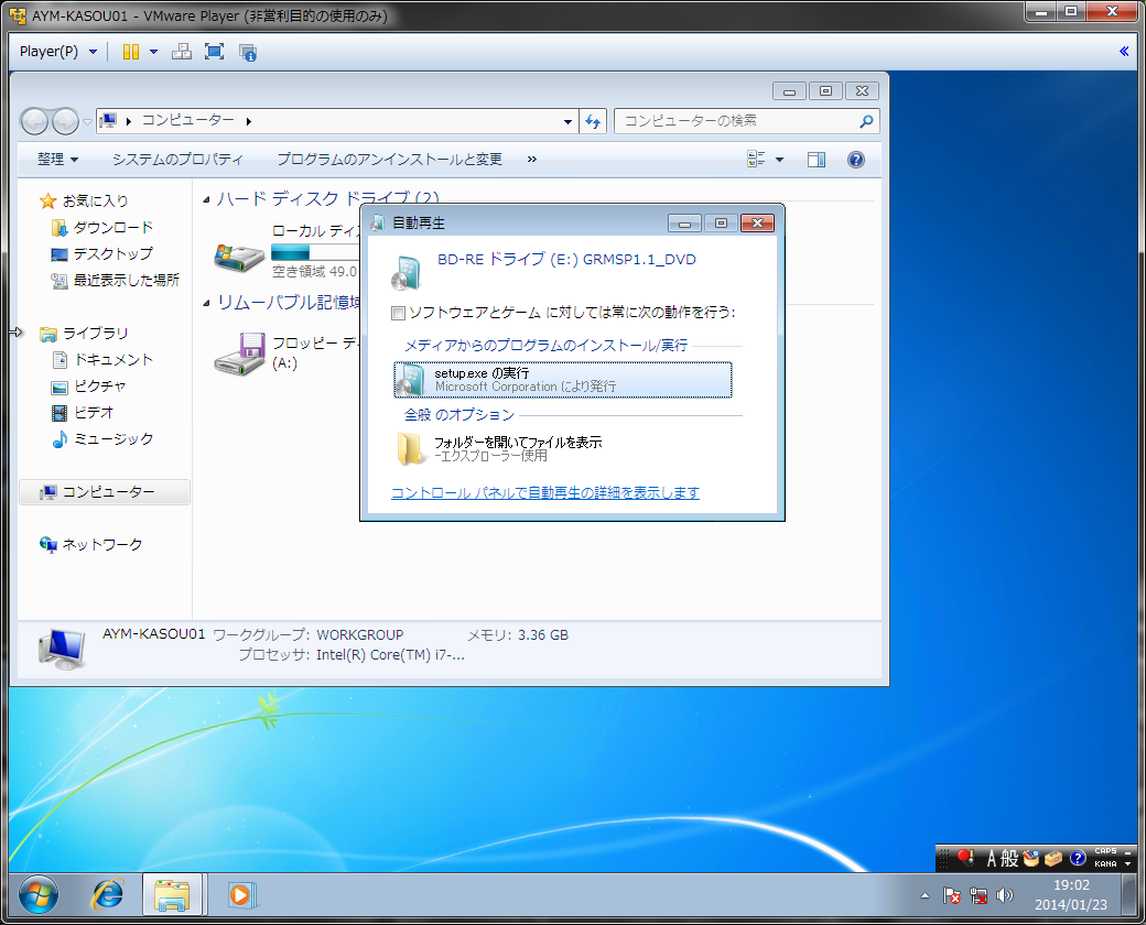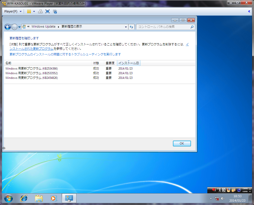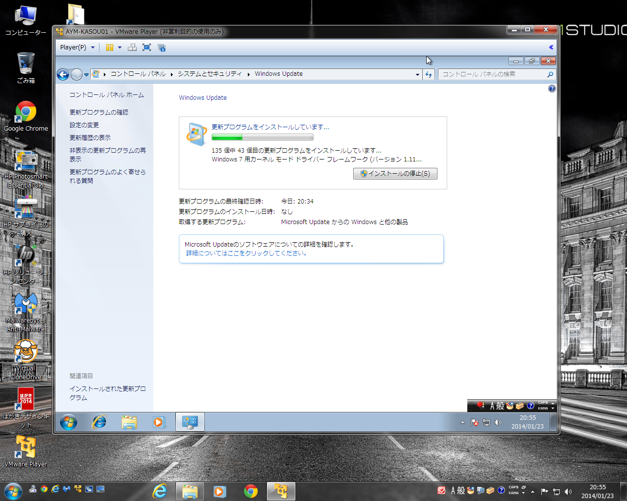 Windows7をNW接続のない状態でSP1にする。 2014年01月23日 カテゴリ:日常エンジニアリングwindows7 mixiチェック アップデートに時間がかかるのでSP1へNWに接続されていない状態でアップデートできないか挑戦してみる。http://windows.microsoft.com/ja-jp/windows7/learn-how-to-install-windows-7-service-pack-1-sp1 ここの記事を参照にしながらやります。 ここからISOをダウンロードしてやればよいようだが、ほかにもいろいろあるので全部ダウンロードしておく。Microsoft Security Essentialsもダウンロードしておく。ばしょはココ。手順はここを参照。手順 1: 重要なファイルをバックアップする仮想OSなのでどうしよう。とりあえずシャットダウンしてコピーしておくか。 手順 2: デバイス ドライバーを更新する仮想OSだし、実機でやるときは問題になるかも。メモメモ。重要: Intel 統合グラフィックス デバイスを使用している場合、特定バージョンの Intel 統合グラフィックス デバイス ドライバーや、特定バージョンの Windows Mail のような D2D 対応アプリケーションに既知の問題があります。手順 3: Windows Update にアクセスし、Windows 更新プログラム KB2454826、KB2534366、または KB2533552 をインストールする (提供されている場合)先ほどダウンロードしたので入れておこう。めんどくさいからDVDにまとめてSP1とは別に焼いておく。とりあえずデスクトップにコピー。コピー終わったらダブルクリックしてインストール。ひとつずつ再起動聞かれるけどめんどくさいから3ついく。3ついれたので再起動。手順 4: ウイルスおよびマルウェアをチェックするMicrosoft Security Essentialsつかってマルウェアがないかチェックする。とりあえずインストールしちゃいます。インストール後検索しますが、NWつながってないのでエラーでますが無視します。結局NWにつながってないと動かないのであんましこの手順は意味ないかも。まぁクリーンインストールでNW接続なしからだから、マルウェアがはいりようないしね。手順 5: Windows 7 SP1 または Windows Server 2008 R2 SP1 をインストールする setup.exe実行しちゃいます。反応しない・・・・。なんだこれ・・・。再起動してもだめぽ・・・・。????ダウンロードしていたexe版をクリックしてみる。うごいた。とりあえず次へいってみるか。 しっぱいしたぽ・・・。 むむむ・・・。どうやらWindows 7 用のシステム更新準備ツール (KB947821) とやらがたりなかったらしい。もっかい焼くか。とりあえず32ビット版と64ビット版ダウンロードしておこう。でもってインストール。再起動してチャンレンジ。やっぱりエラーでとまる。うーむ・・・。あきらめてネットでやるか。 135個でてきた。最初に悪意のソフトが出てきたのでそれを入れておけばよかったのかな。 SP1もあたったし、あんまり深く考える必要ないかw