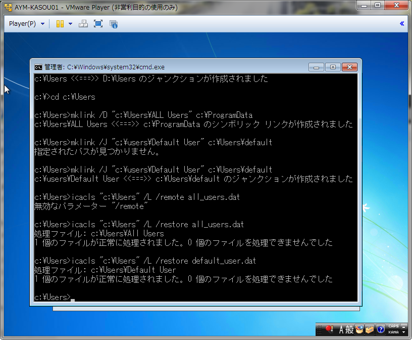 Windows 7でユーザプロファイルフォルダ(C:\Users)を別ドライブに移してみるを仮想サーバで実験してみる③ユーザ設定前 2014年01月22日 カテゴリ:日常エンジニアリングwindows7 mixiチェック http://blog.chira-ura.info/2011/07/09/726この記事を参考に進めていきます。 1. インストールプロセスの最後のアカウント作成画面で(ユーザを作る前に)コマンドプロンプトを起動以下の画面のときにShift + F10でコマンドプロンプトを起動する。 コマンドプロンプト画面がひらく2. “C:\Users\All Users”と”C:\Users\Default User”のACLを保存“All Users”と”Default User”はジャンクション(Junction)とシンボリックリンク(Symlink)で、このACLをicaclsコマンドでファイルに保存しておく。(後工程で必要になる) →半分くらい意味わかってない。C:\>cd C:\UsersC:\>robocopy C:\Users D:\Users /MIR /COPYALL /XJ C:\Users>icacls "All Users" /L /save all_users.datC:\Users>icacls "Default User" /L /save default_user.datとあったので実際やってみた。C:\>rmdir /S C:\UsersC:\>mklink /J C:\Users D:\Users たくさん行がでてきたので処理されたっぽい。みちのりはながい・・・。4. /XJオプションでコピーされなった接合を手動作成Junction/Symlinkを作った後は、最初に保存しておいたACLをicaclsコマンドでリストアする。C:\>cd C:\UsersC:\Users>mklink /D "C:\Users\All Users" C:\ProgramDataC:\Users>mklink /J "C:\Users\Default User" C:\Users\DefaultC:\Users>icacls "C:\Users" /L /restore all_users.datC:\Users>icacls "C:\Users" /L /restore default_user.dat とりあえず途中でいっかいコマンドつづり間違えたけど大丈夫そう。