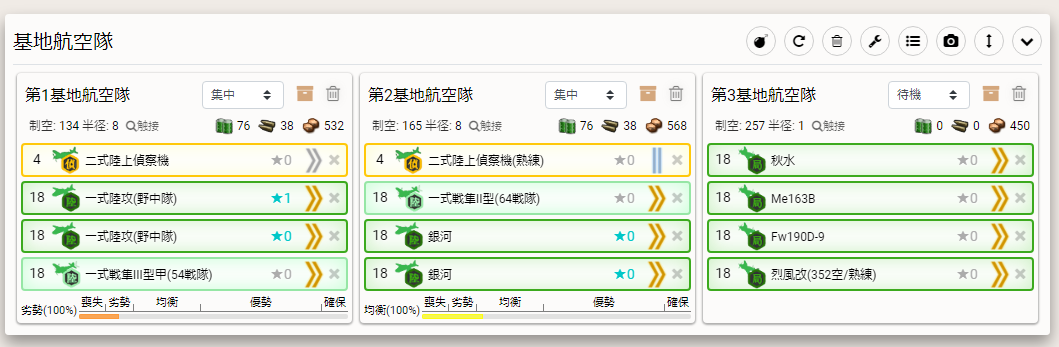 ※ボスゲージ1は通常艦隊や他にもっとよいルートあるかもですが札を付けないように抑制するならこんな感じ。